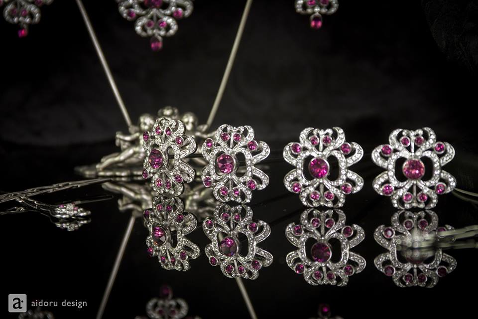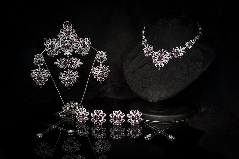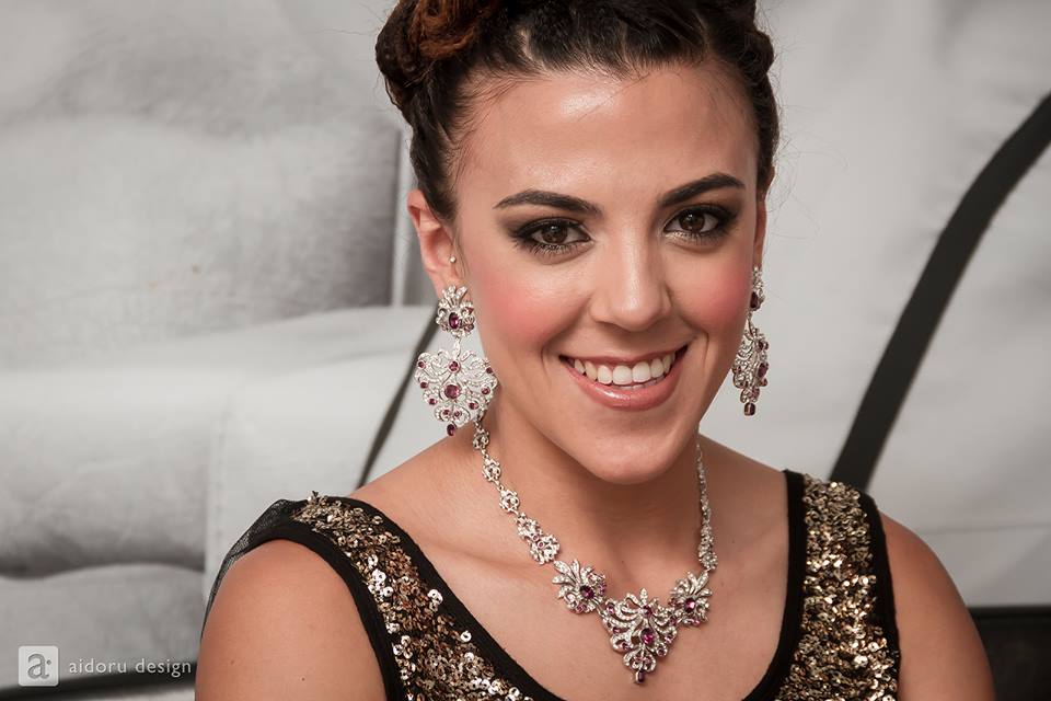Paula va lluir un guarniment ametlat amb ornamentació vegetal muntat en ametista i vidre de Swarovski i acabat en rodi. Tota una llampada de llum, ja que el guarniment consta de 1035 pedres, totes elles muntades a mà.