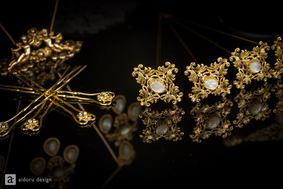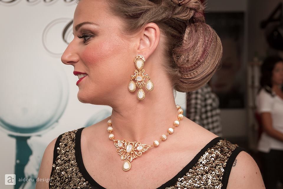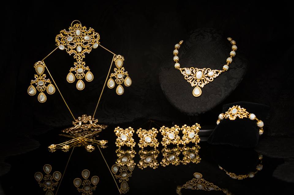 Lucia va lluir un adreç model girant-les muntat en nacre natural i vidre de Swarovski xapat en or. Al coll un collaret del joc amb motiu centrals i comptes de nacre de 9 mm encastades amb casquilles.
