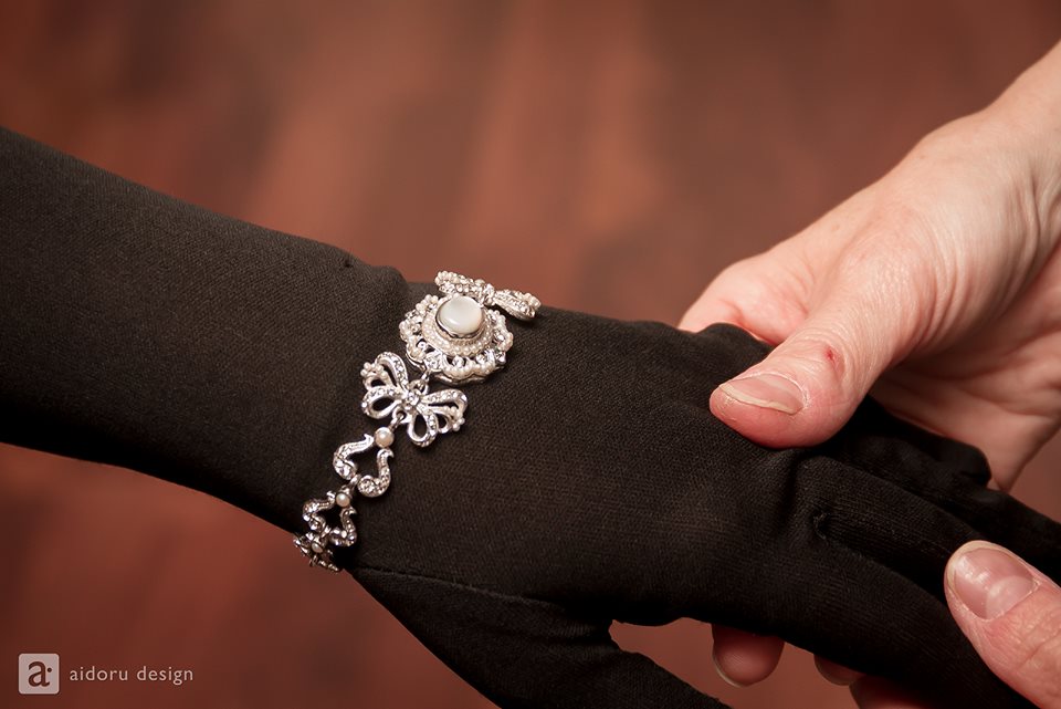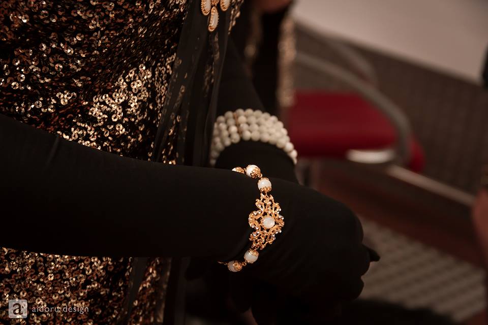 En les mans portava dos complements diferents, en la dreta portava una polsera amb motiu centrals i comptes de nacre de 9 mm encastades en casquillas i en l’esquerra lluïa una polsera de 4 voltes de comptes de nacre natural de 8 mm.