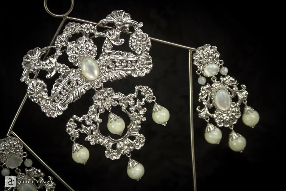 Irene va lluir un adreç cisellat i repujat muntat en nacre natural, amb pedra central de 14 x 10 i terminació de tres comptes de nacre de 9 mm rematada amb unes casquilles calades. La “joia” de dos cossos. Tot això combinat amb vidre de Swarovski i acabat en rodi.