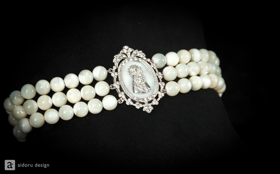 Al coll un collar de tres tires de nacre de 9 mm amb medalló central de nacre natural amb verge incrustada en el centre. En les mans portava dos polseres articulades combinades en nacre i vidre de Swarovski.