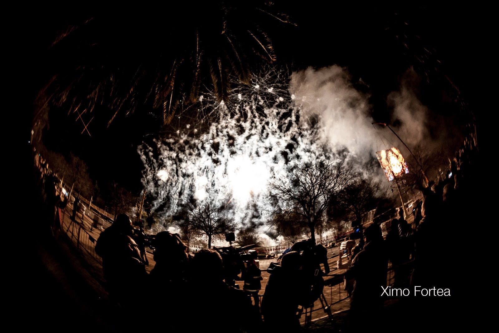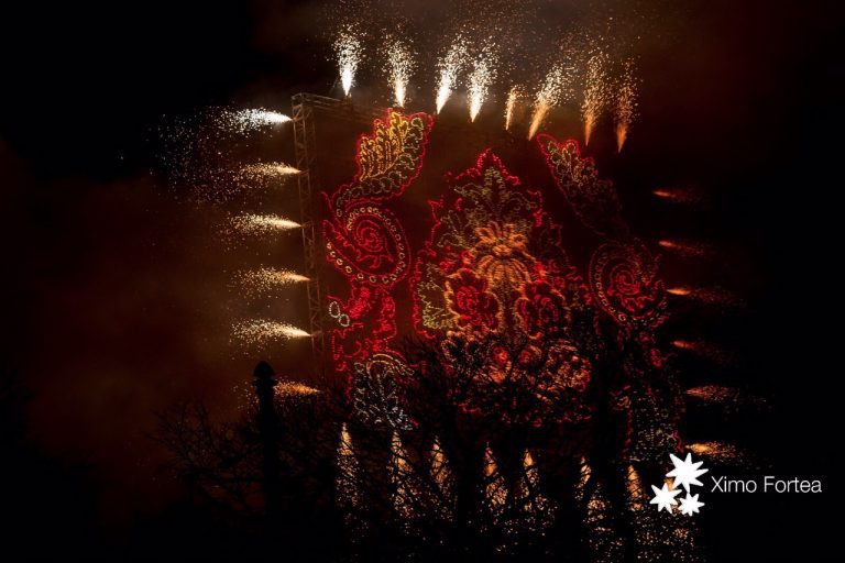 Ricardo Caballer, de la pirotècnica Ricasa, i Vicente Enguídanos, mestre seder, van encendre la metxa d’aquest espectacle que va arrancar sobre una gran plataforma a 50 metres d’altura, teixint amb l’explosió de la pólvora el disseny floral de l’Espolí Fallera Major de València.