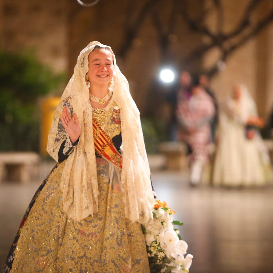 Les Falles 2018 han viscut un dels seus grans moments amb el final de la primera jornada d’Ofrena. La fallera major infantil de València, Daniela Gómez dels Àngels, ha tancat un festeig que, des de dos quarts de quatre de la vesprada, ha portat a 49.570 persones als peus de la imatge de la Verge dels Desemparats.