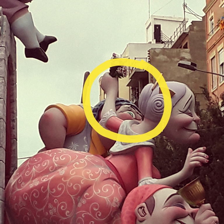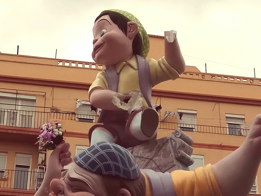 La comissió ha comunicat que a causa de causes meteorològiques, la falla s’ha vist afectada, trencant-se les mans del xiquet que figura dalt del remat i per esta ruptura s’ha vist afectada la cara de l’home del remat.