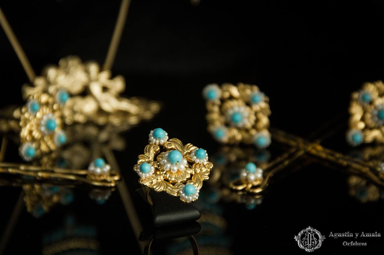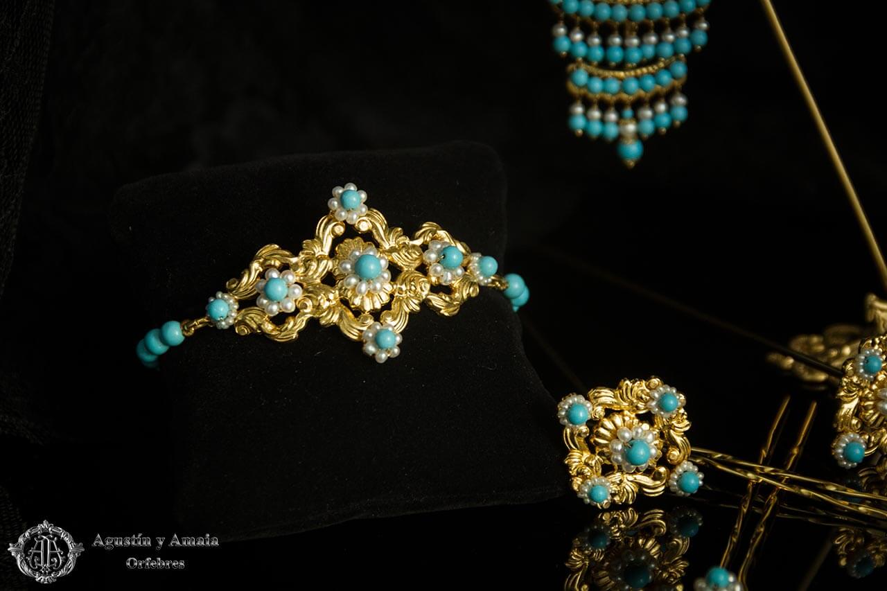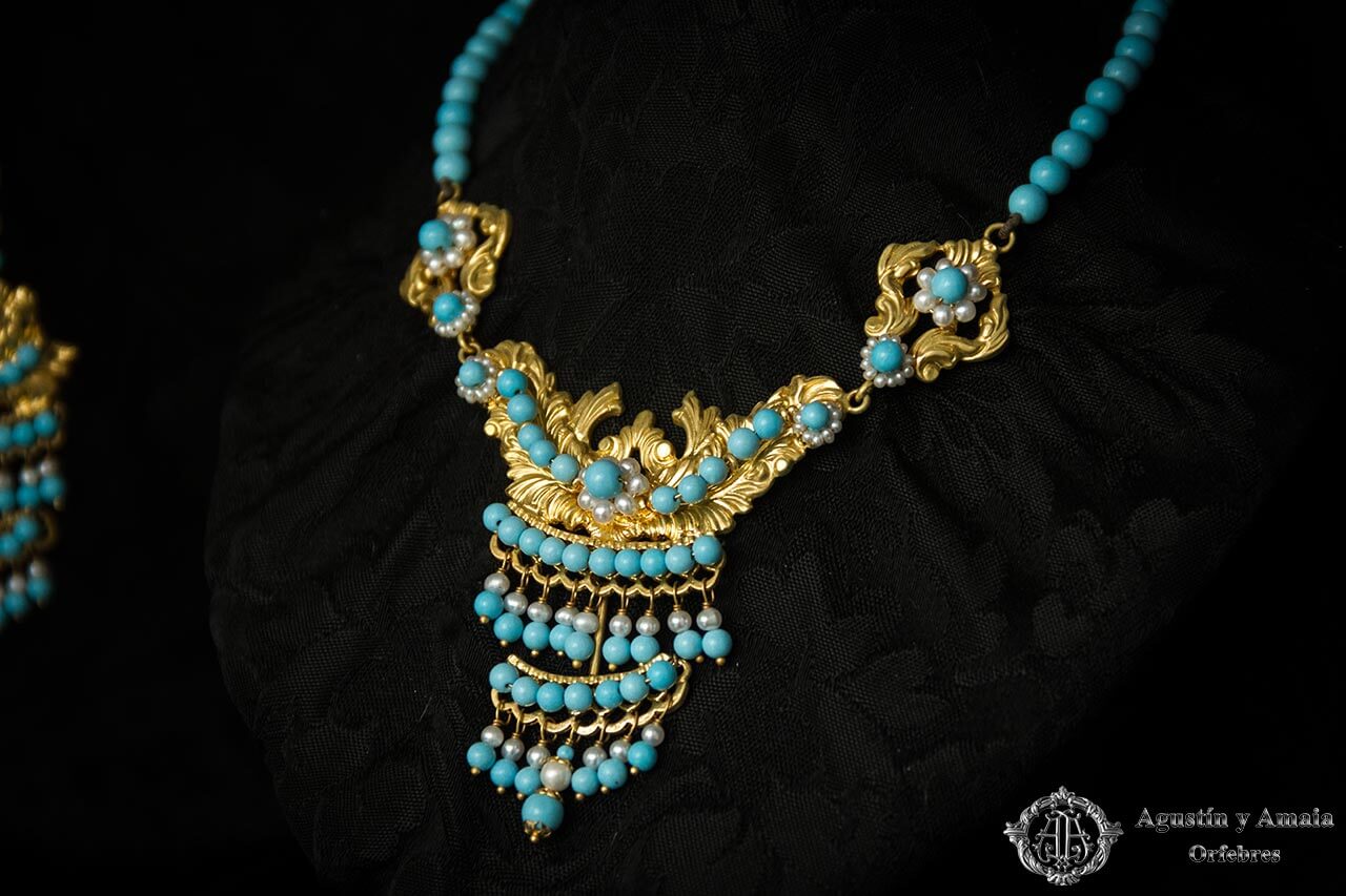 Els orfebres Agustín i Amaia amplien la col·lecció de adreços del segle XIX amb este model de balcó cisellat i repujat amb dos altures, combinat en turquesa amb perla cultivada i xapat en or.