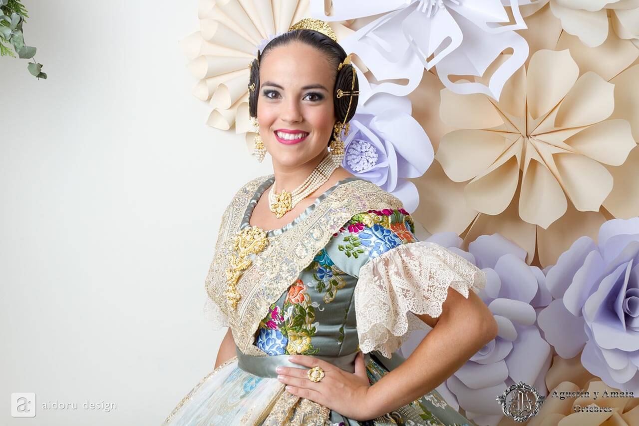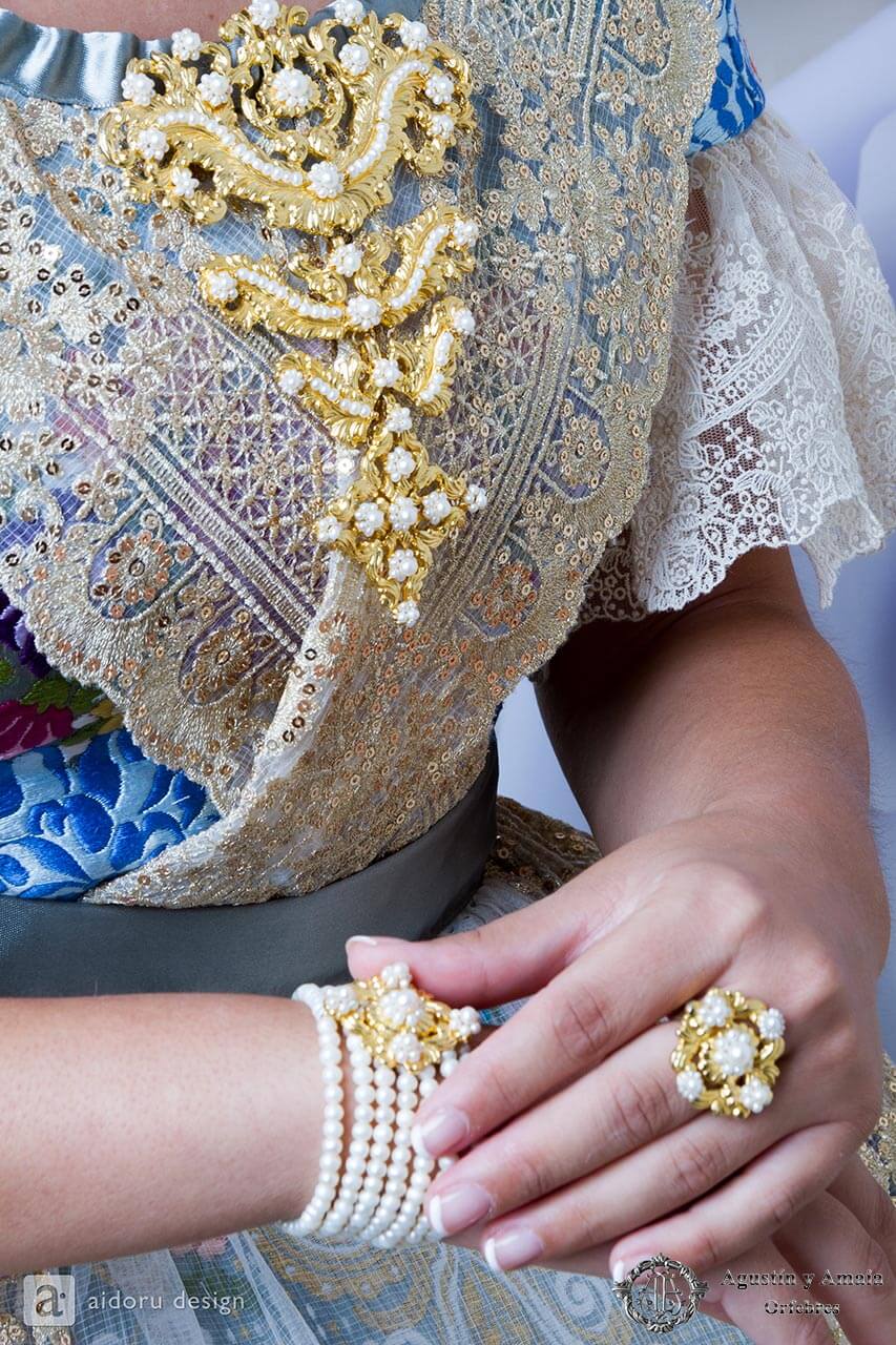 Per a Carla s’ha realitzat el mateix model Dénia, però en la seua versió infantil, amb un pendent de 4 altures de perla cultivada en el xanglot, collar i polsera d’un centre i 5 voltes de perles amb el seu anell i agulla de banda a joc.