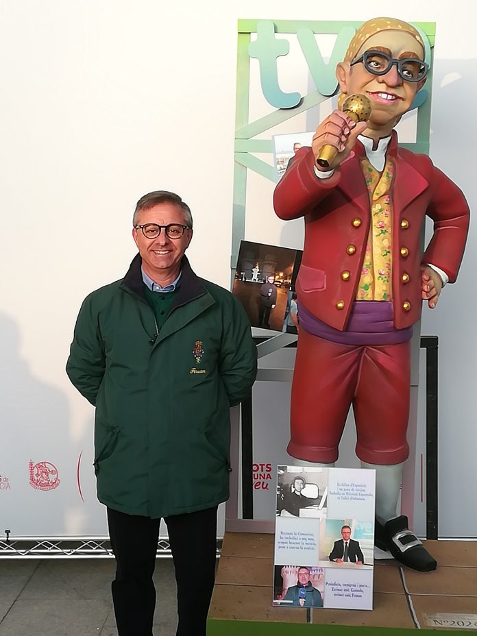 Per a açò es va cercar a algú que fóra faller, valencià i que haja tingut un paper destacat en la festa. És per açò que l’artista i la directiva van pensar en Ferran Garrido, durant molts anys director d’Informatius de TVE a la Comunitat Valenciana. El periodista ha cobert en nombroses ocasions la festa per a la televisió nacional i ha posat veu a nivell nacional i internacional a la nostra festa amb peces per a informatius i programes.