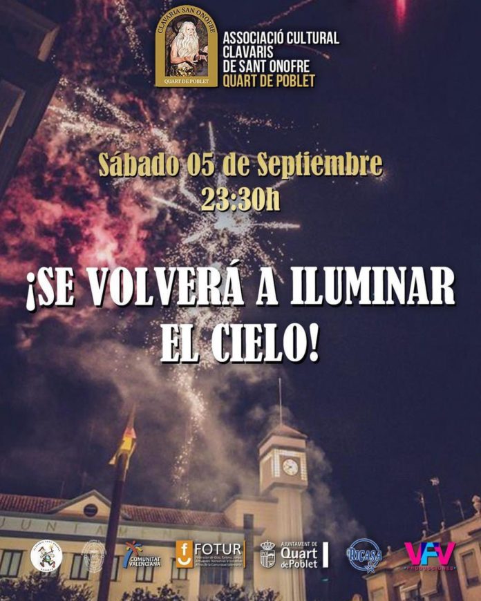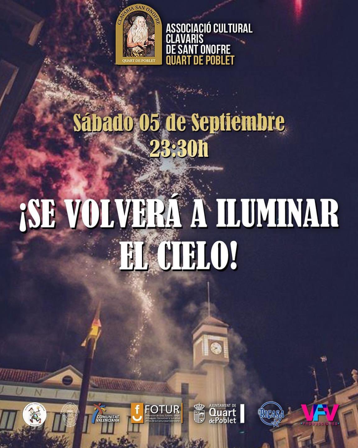 Aqueix mateix dia a les 23.30 hores des d’una ubicació alta i visible des de qualsevol finestra, balcó o terrassa de Quart de Poblet per a així no convocar concentracions innecessàries en aquests temps de la COVID-19 es podrà veure i gaudir d’un castell a càrrec de Ricardo Caballer que tornarà a il·luminar el cel de Quart de Poblet per a festejar al seu patró.