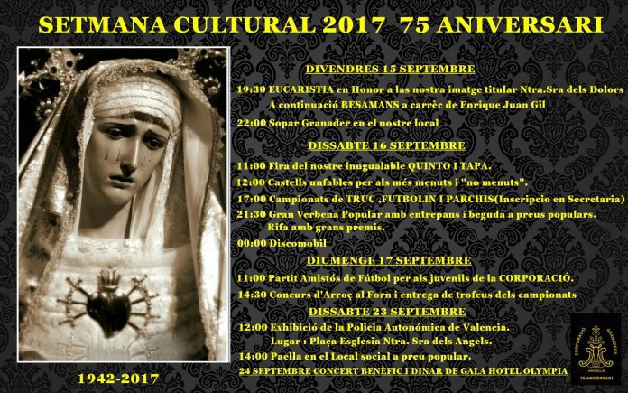 La Corporació Armada de Granaders de la Verjurada dels Dolors de la Parròquia de la Mare de Déu dels Ángeles del barri del Cabanyal de València inicia hui, 15 de setembre, els actes de la setmana cultural amb la celebració del Besamà a la seua imatge titular en l’esmentada parròquia, el capellà de la qual, Enrique Gil, serà qui tinga l’honor d’obrir l’acte després de l’Eucaristia, i a continuació serà el Mestre Major del Gremi de Sastres i Modistes, Fran Tochena, qui li prenga el relleu per a, a continuació, fer-ho tots els fidels i devots assistents.