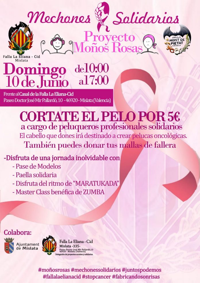 Les activitats programades per a aquest dia són una sessió de tall de pèl solidari, a càrrec de peluquer@s solidari@s del municipi de Mislata que treballen com a voluntaris. Aquestes donacions de pèl aniran destinades a l’Associació “Mechones Solidaris”, encarregada de fer perruques oncològiques destinades a persones que pateixen càncer. Totes aquelles persones interessades que aporten un donatiu de 5€ es podran tallar el pèl i alhora col·laborar perquè el seu pèl es convertisca en perruques oncològiques. A més, també arreplegarem perruques ja confeccionades i seran donades al banc de pròtesi de l’Associació Espanyola Contra el Càncer.