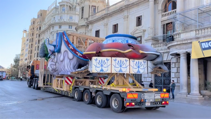 La falla municipal de València ja ha sortit al carrer. Aquesta tarda la Plaça de l’Ajuntament ha rebut les primeres peces del gran monument que presidirà l’esplanada consistorial en la setmana gran de les festes falleres.