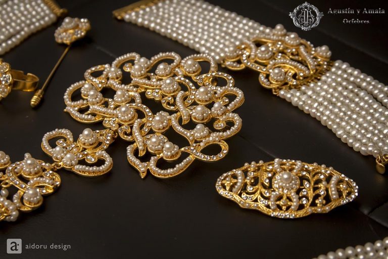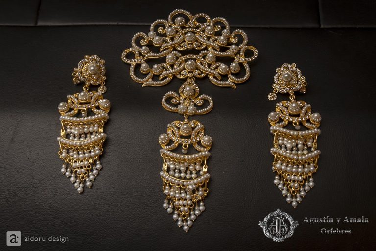 Maragda Escrivá Noguera llueix un amanisc de doble balconada en perla conreada de diferents grandàries, des de de la perla de 4 mil·límetres, fins a la mes valorada, la perla d’1,5 cm; tot cosit a mà en perla de mostassa i combinat en cristall de Swarovski.
