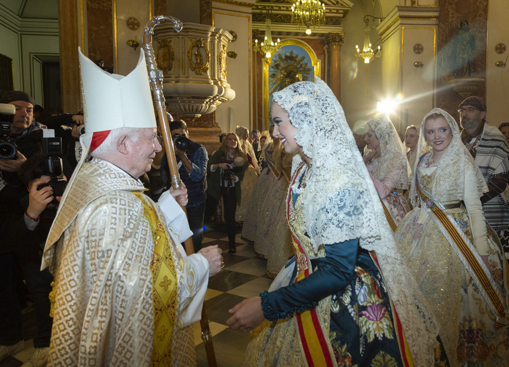 El cardenal arquebisbe de València, Antonio Cañizares, va rebre anit en la Basílica a la Fallera Major de València, Marina Civera Moreno, qui va lliurar el seu ram a la patrona dels valencians, juntament amb la seua Cort, en finalitzar la segona jornada de l’Ofrena de Falles.