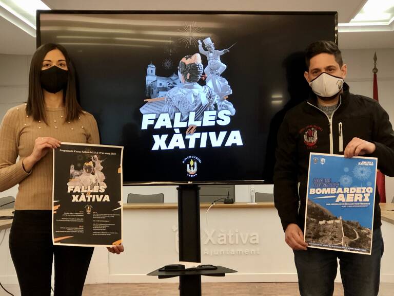 El president de la Junta Local Fallera de Xàtiva, Jesús González, i la regidora de Falles Maria Beltrán han presentat els actes programats per a la setmana de falles d’enguany 2021.