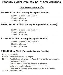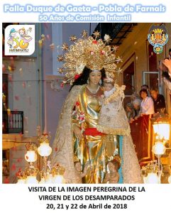 Aquests són els actes commemoratius amb motiu de la visita de la Imatge Pelegrina de la Verge dels Desemparats a la nostra demarcació amb motiu de la celebració de les Noces d’Or de la comissió infantil.
