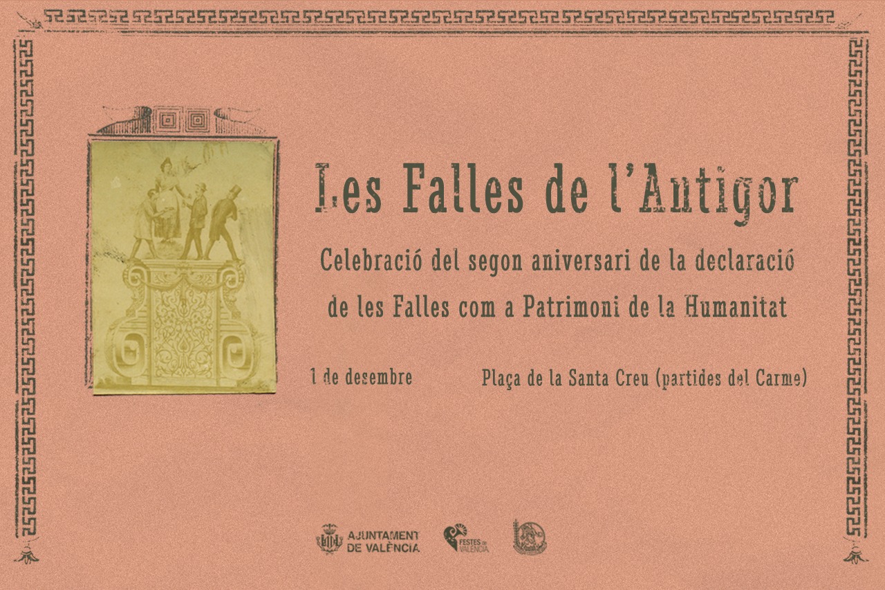 Amb motiu del segon aniversari de la inclusió de les Falles en la llista de Patrimonis Culturals Immaterials de la Humanitat per la UNESCO, l’Ajuntament, mitjançant la Regidoria de Cultura Festiva i en col·laboració amb la Delegació de Promoció del Patrimoni de Junta Central Fallera (JCF), ha presentat el programa de festejos, el lema del qual és ‘Les Falles de l’Antigor’ i que se centra en els inicis de les Falles, a la fi del segle XIX. Se celebrarà en el barri del Carmen durant dissabte 1 de desembre.