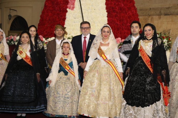 En arribar a la geperudeta, Carmen i Leyre entregaren els rams a la patrona de València, i en companyia de l’alcalde, Jesús Ros, i el regidor de Falles, José Antonio Castillejo, cantaren l’himne de la Mare de Déu, de Torrent i de València.