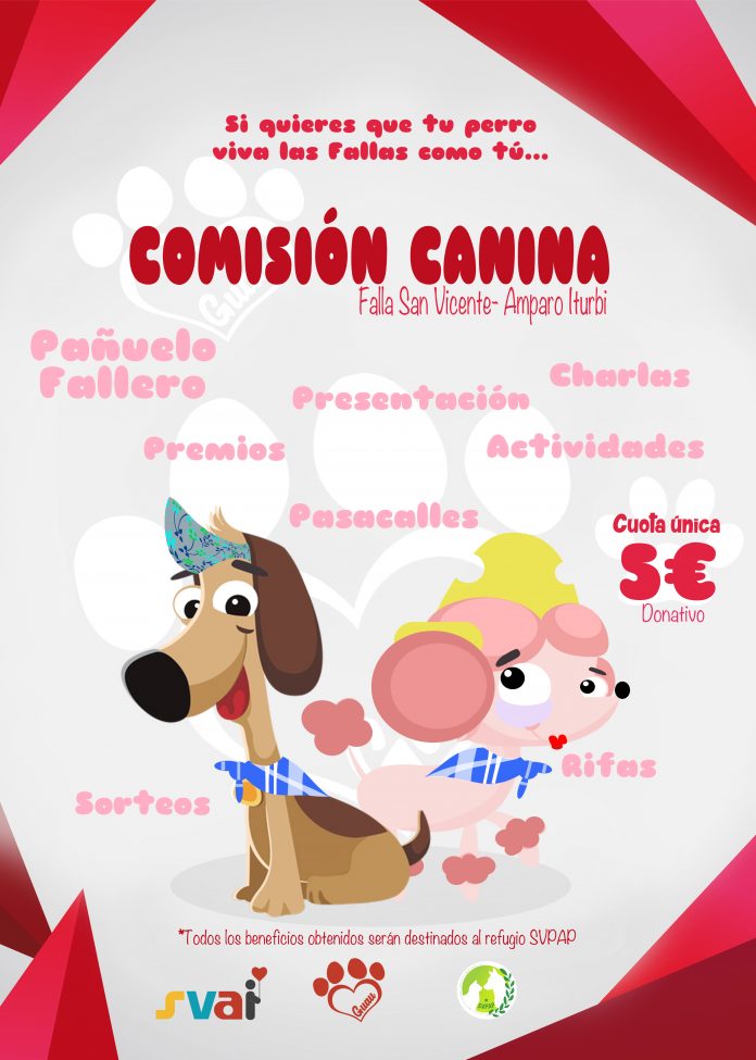 La comissió està pensada per a tots els gossos que vulguen formar part d’ella i per una quota única de 5€ la teua mascota podrà assistir el pròxim mes de gener a la seua pròpia presentació en la qual a més de conèixer nous amics i provar suculents premis rebrà com a membre de la falla el seu mocador commemoratiu perquè lluïsca ben bonic aquestes falles i una orla amb tots els membres de la comissió.