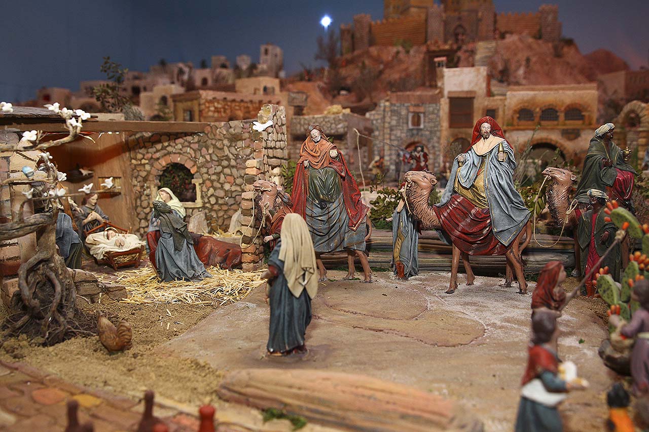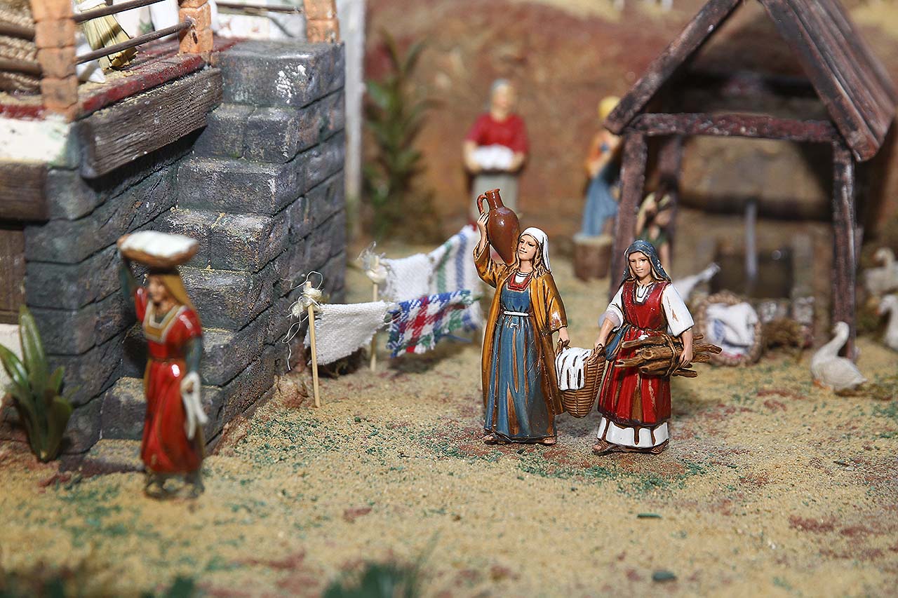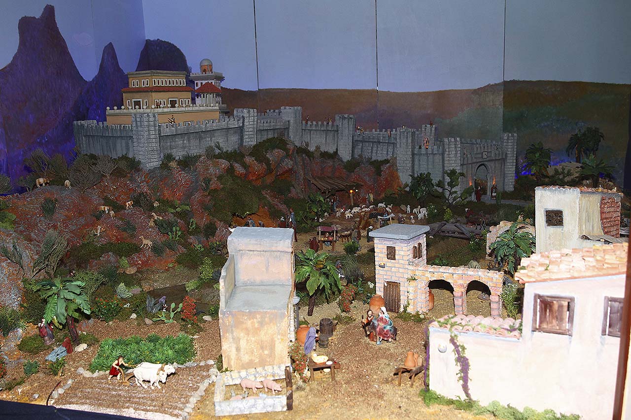 Joaquín Checa Valero ens explica com és el seu pessebre. Ens conta que han investigat com eren les construccions de l’època. S’ha reproduït la Fortalesa Antonia i el Temple de David. Han intentat fer-ho el més semblant a com hauria sigut en l’època de Jesucrist. El pessebre te 28 metres quadrats i porten treballant en ell des del mes de setembre, amb un grup nombrós de participants, ja que és una activitat que “fa falla”. Són incalculables les hores invertides en el treball de muntatge del pessebre.