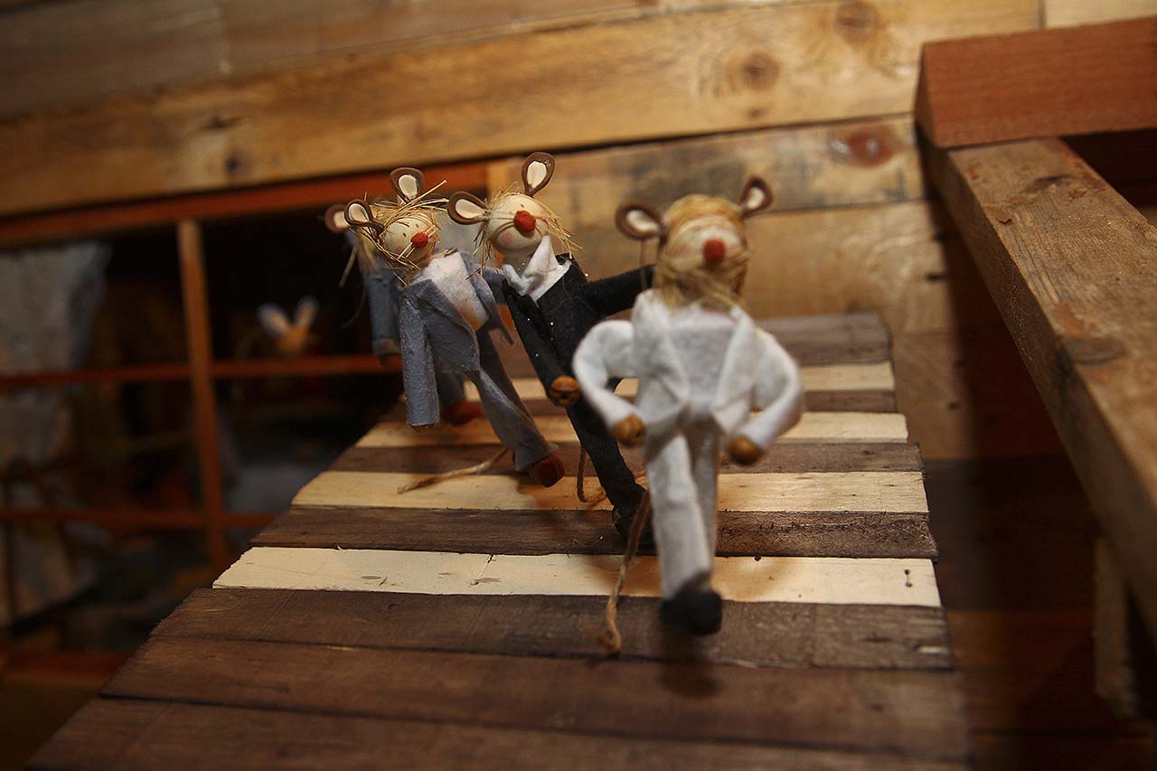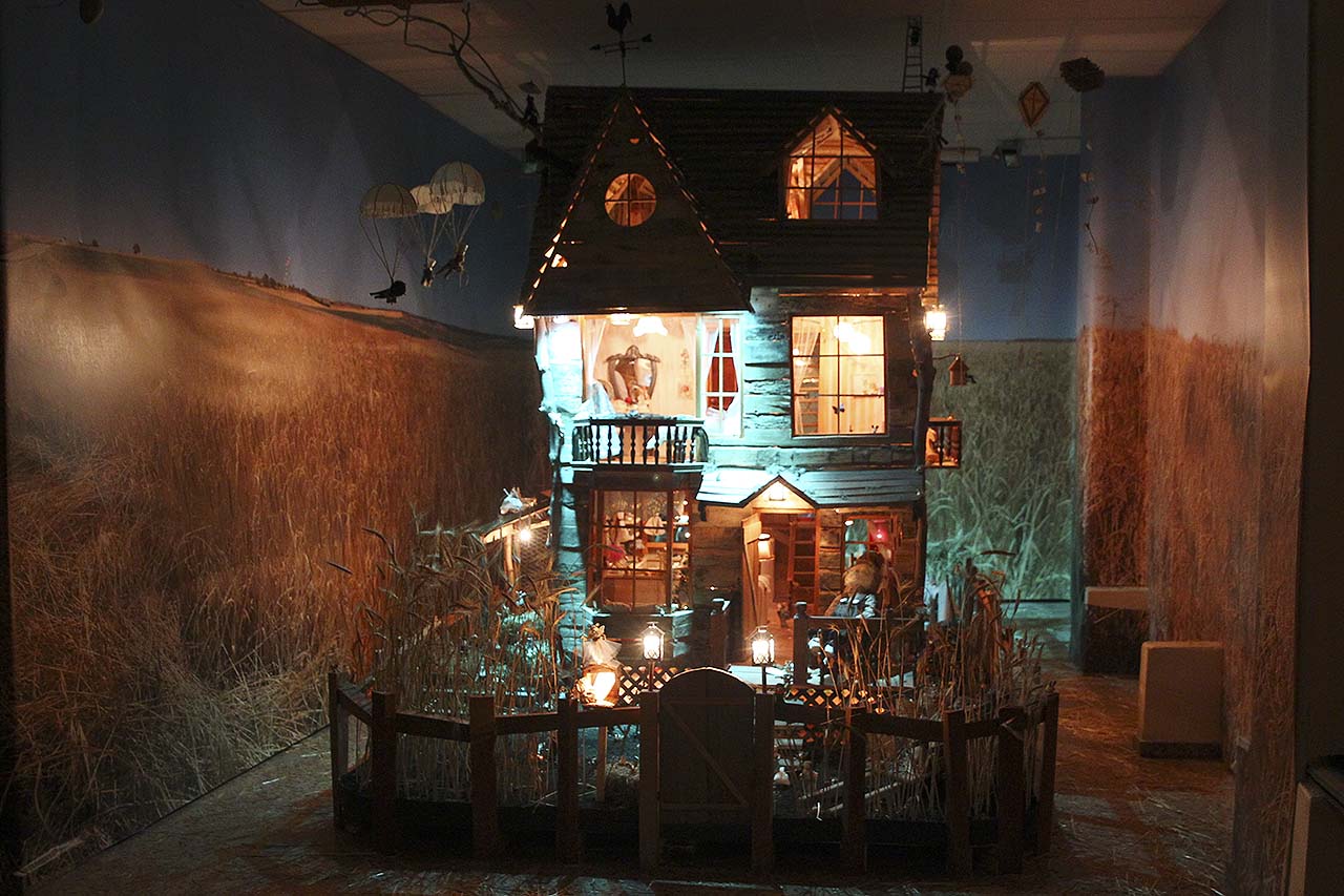 Granja envoltada de camps de blat, que té un jardí posterior on es poden veure contes infantils, convertint el casal en una granja, amb bales de palla, ratolins volant, ninots volant etc.