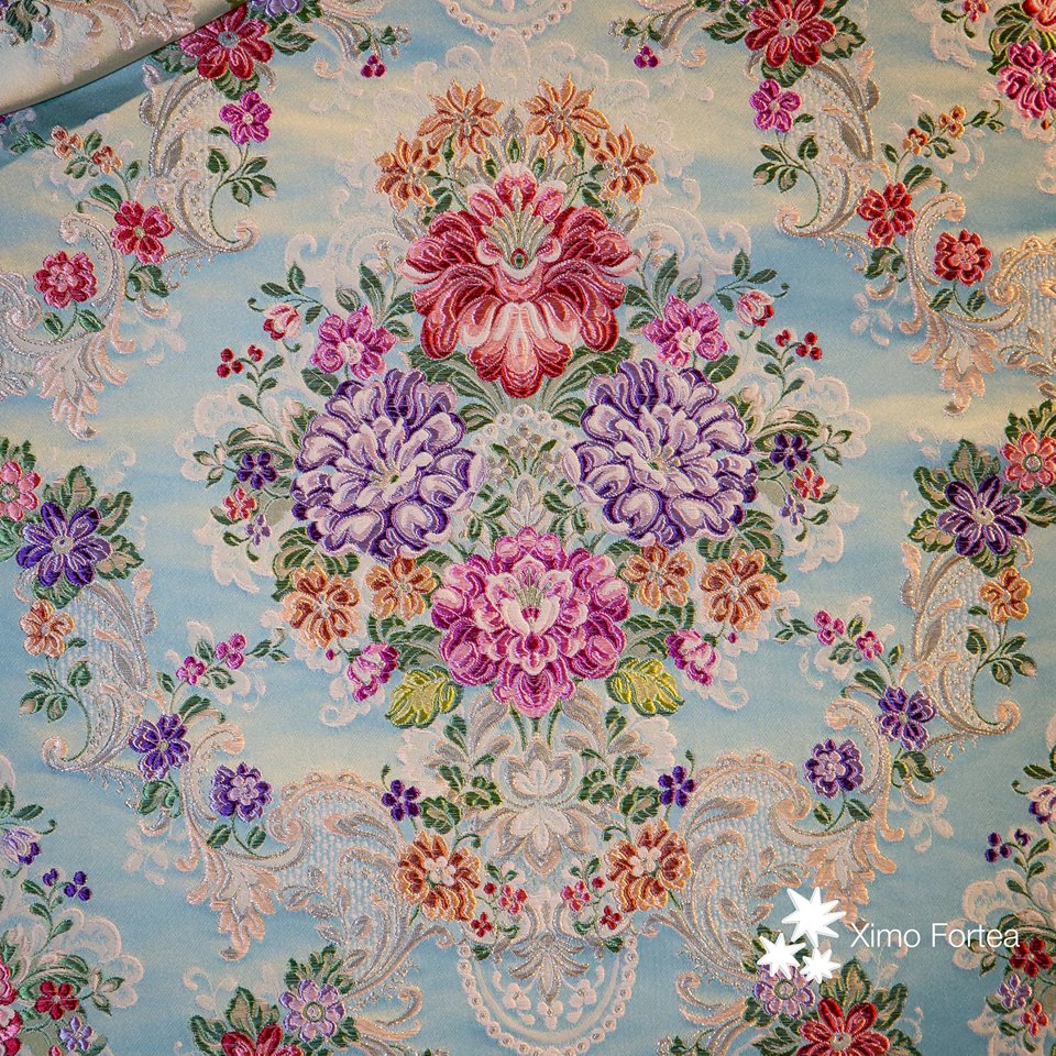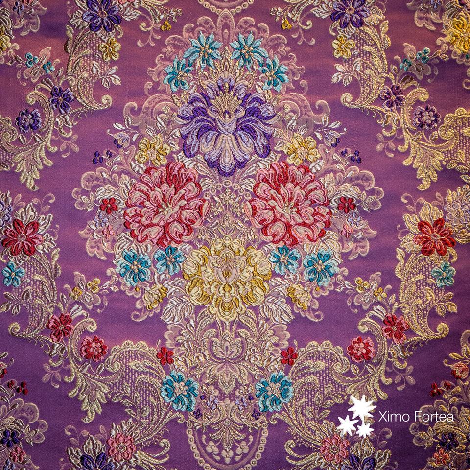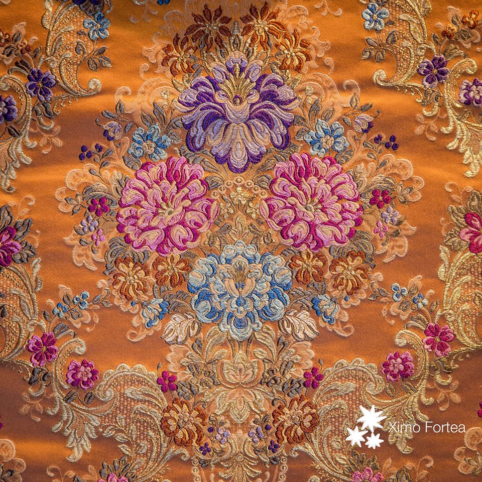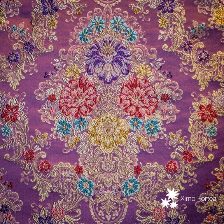 Per la seua banda, per al trage del segle XIX, Vives i Marí ha triat un lampàs estret de seda natural que es denomina “Alegria”. Este dibuix és característic dels dissenys valencians de l’època i pertany a la col·lecció de dibuixos antics de la firma. La seua principal característica és el ram central, emmarcat per una orla, i igualment destaca este teixit pel seu fons de noblesa, treballada en un to champagne.